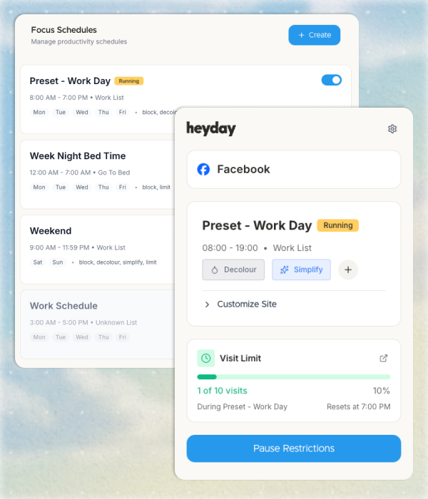"As a chronic scroller, Heyday's features helped my productivity. I especially liked how it changed selected sites to black and white which makes it less incentivizing to scroll instagram and mindlessly shop online. It's customizable and easy to use."
