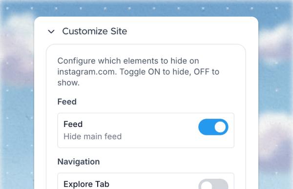 When you visit Instagram, the feed is automatically hidden. DMs, posting, stories, and profile management all work normally. The main feed, explore page, and algorithmic recommendations don't load.