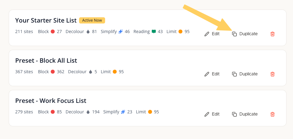 Open any site list card and hit Duplicate. It copies the full list, sites and impact settings, as a starting point for a new configuration. Useful when you want variations of the same setup (weekday vs. weekend rules, or a stricter version for deep work).