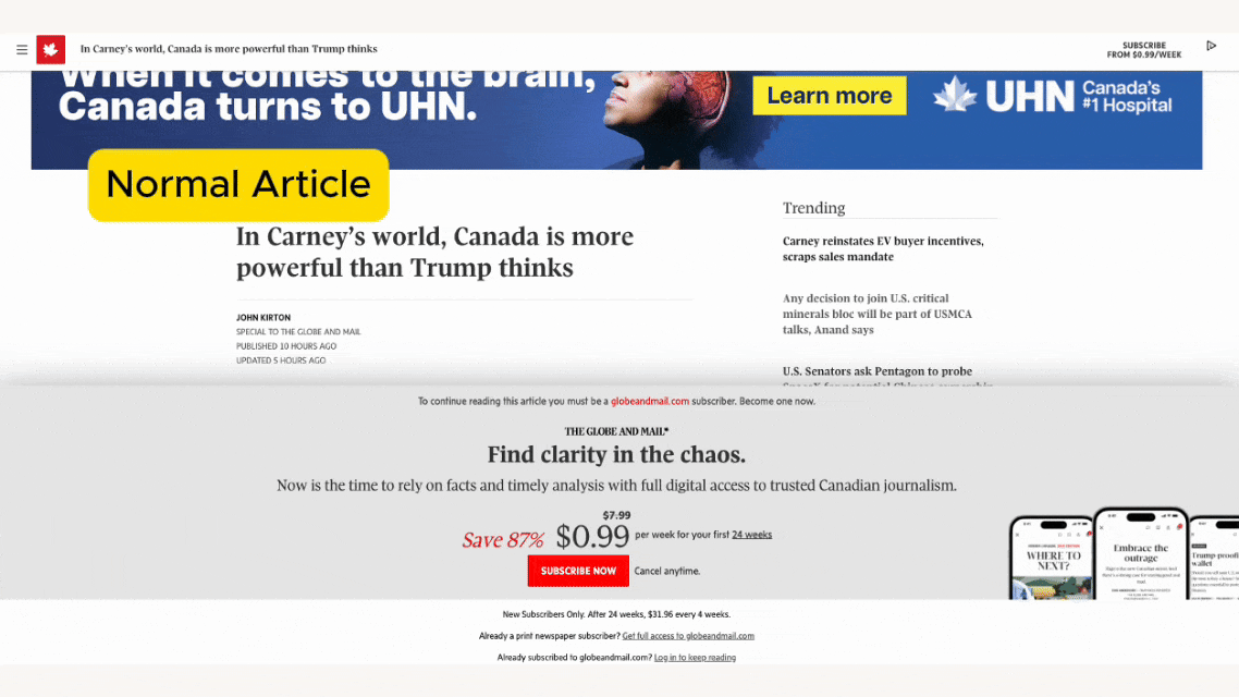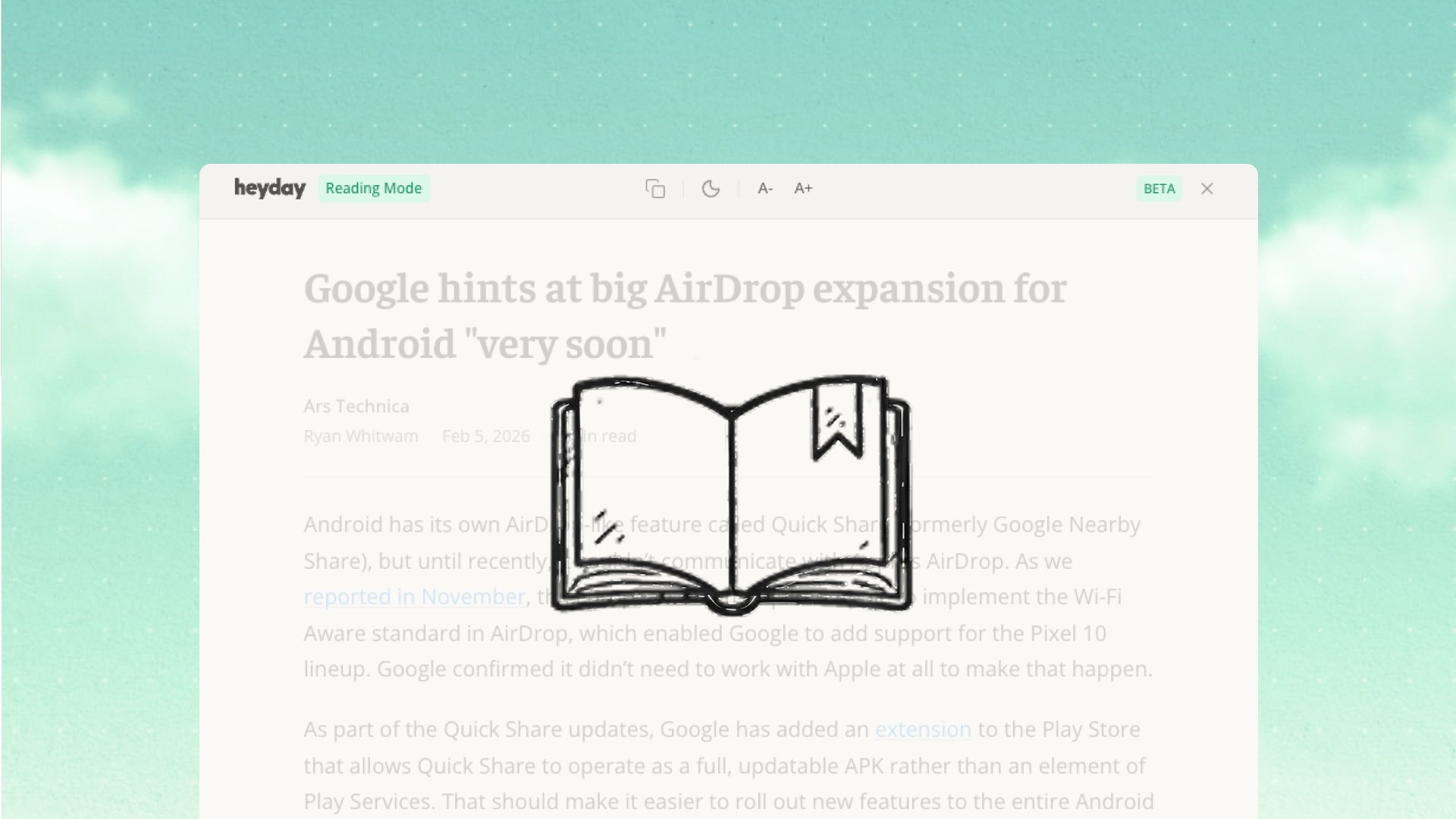 Reader Mode is a new Heyday impact that pulls article content into a clean, distraction-free overlay. No ads. No sidebars. No algorithmic clutter.